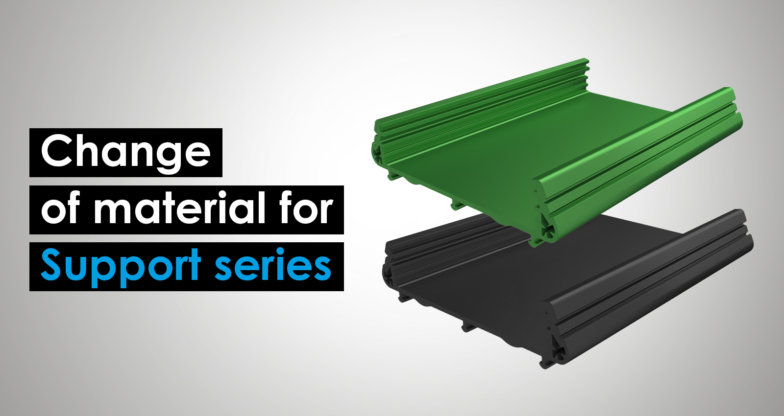 È con piacere che vi confermiamo l’inizio del processo di cambiamento del materiale plastico usato nella produzione di tutte le barre della serie SUPPORT, dopo i risultati positivi delle prove di compatibilità degli stampi.